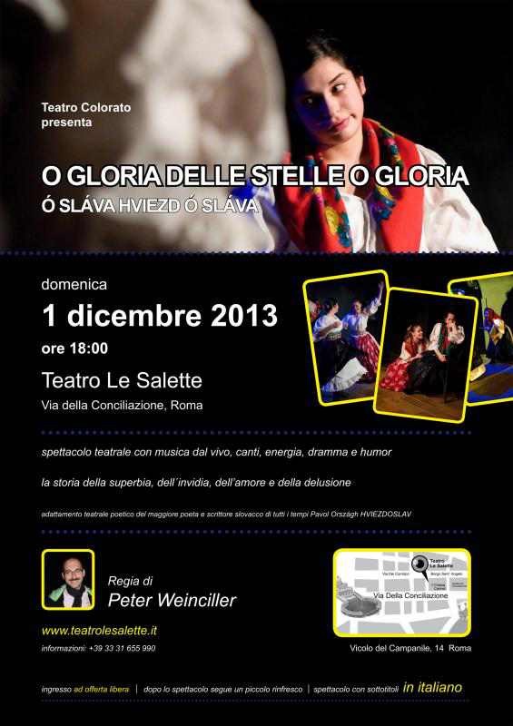 di Pavol Orszàgh Hviezdoslav regia di Peter Weinciller compagnia Teatro Colorato Spettacolo teatrale con musica dal vivo, canti, energia, dramma e humor. La storia della superbia, dell’invidia, dell’amore e della delusione. Un adattamento poetico del maggiore poeta e scrittore slovacco di tutti i tempi, Pavol Orszàgh HVIEZDOSLAV ORE 18,00 INGRESSO LIBERO AD OFFERTA Dopo lo spettacolo seguirà un piccolo rinfresco Per informazioni: 333 1655990 lubomir-majtan@libero.it