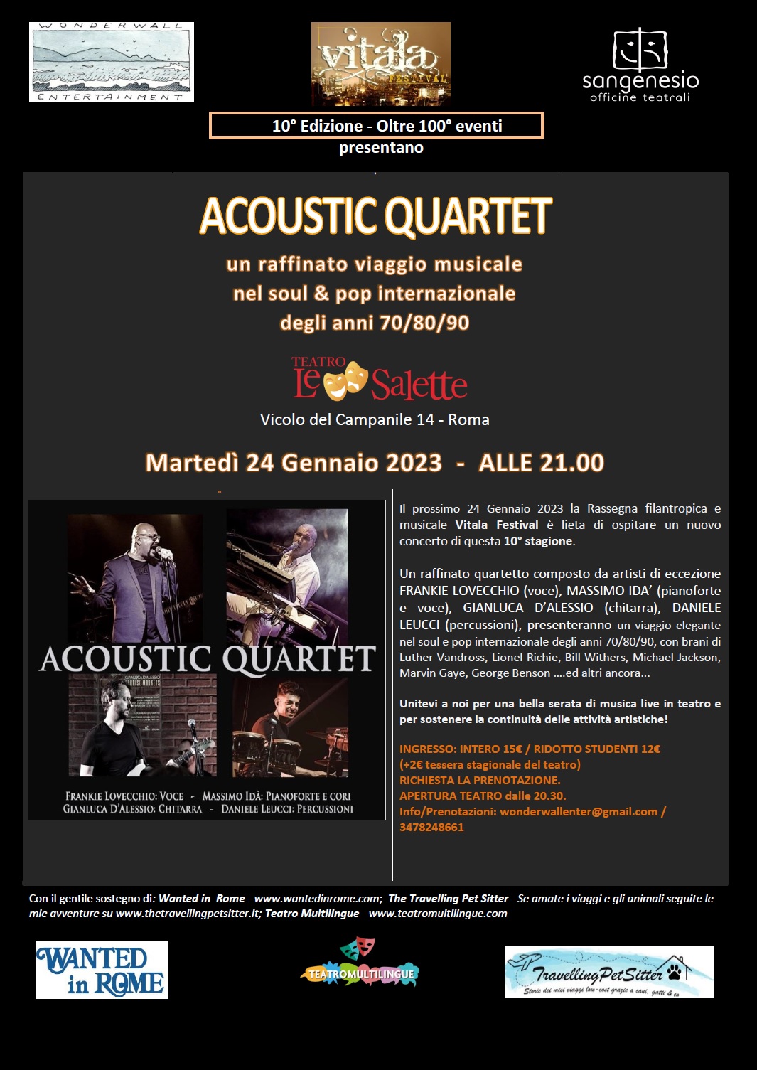 Il prossimo 24 Gennaio 2023 la Rassegna filantropica e musicale Vitala Festival è lieta di presentare un nuovo concerto di questa 10° stagione. Un raffinato quartetto composto da artisti di eccezione FRANKIE LOVECCHIO (voce), MASSIMO IDA’ (pianoforte e voce), GIANLUCA D’ALESSIO (chitarra), DANIELE LEUCCI (percussioni), presenteranno un viaggio elegante nel soul e pop internazionale degli anni 70/80/90, con brani di Luther Vandross, Lionel Richie, Bill Withers, Michael Jackson, Marvin Gaye, George Benson ….ed altri ancora… Unitevi a noi per una bella serata di musica live in teatro e per sostenere la continuità delle attività artistiche!