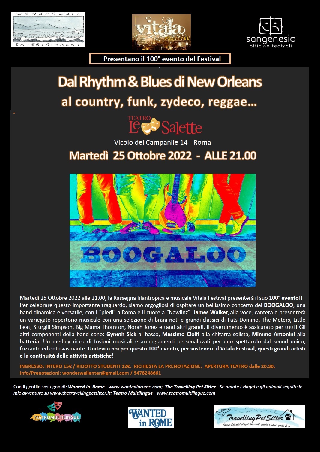 Il prossimo Martedì 25 Ottobre 2022 alle 21.00, al Teatro Le Salette, la Rassegna filantropica e musicale Vitala Festival presenterà il suo 100° evento! Per celebrare questo importante traguardo, siamo lieti di ospitare un bellissimo concerto dei BOOGALOO, una band frizzante, dinamica e versatile. James Walker, alla voce, canterà e presenterà un variegato repertorio musicale con una selezione di brani noti e grandi classici di Fats Domino, The Meters, Little Feat, Sturgill Simpson, Big Mama Thornton, Norah Jones e tanti altri grandi. Una serata di Rhythm&Blues e non solo! Gli altri componenti della band sono: Gyneth Sick al basso, Massimo Ciolfi alla chitarra solista, Mimmo Antonini alla batteria. Un medley ricco di fusioni musicali e arrangiamenti personalizzati per uno spettacolo dal sound unico ed entusiasmante. Il divertimento è assicurato per tutti! Unitevi a noi per questo 100° evento, per sostenere il Vitala Festival e la continuità delle attività artistiche! Grazie!