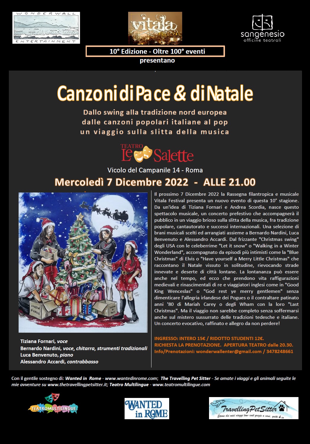 Mercoledì 7 Dicembre 2022 alle 21.00, la Rassegna filantropica e musicale Vitala Festival presenta un nuovo evento di questa 10° stagione. Da un’idea di Tiziana Fornari e Andrea Scordia, nasce questo spettacolo musicale, un concerto prefestivo che accompagnerà il pubblico in un viaggio brioso sulla slitta della musica, fra tradizione popolare, cantautorato e successi internazionali. Una selezione di brani musicali scelti ed arrangiati assieme a Bernardo Nardini, Luca Benvenuto e Alessandro Accardi. Dal frizzante “Christmas swing” degli USA con le celeberrime “Let it snow” o “Walking in a Winter Wonderland”, accompagnato da episodi più intimisti come la “Blue Christmas” di Elvis o “Have yourself a Merry Little Christmas”. Da “Good King Wenceslas” o “God rest ye merry gentlemen” all’allegria irlandese dei Pogues o il contraltare patinato anni ’80 di Mariah Carey o degli Wham con la loro “Last Christmas”. Ma il viaggio non sarebbe completo senza soffermarsi anche sul mistero sussurrato delle tradizioni tedesche e italiane. Unitevi a noi per questa bella serata di musica festiva e per sostenere la continuità delle attività artistiche!