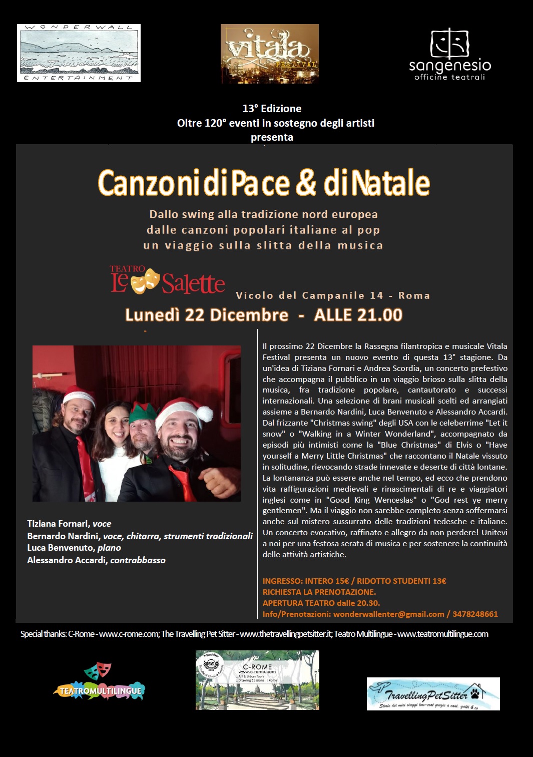 Il prossimo 22 Dicembre la Rassegna filantropica e musicale Vitala Festival presenta un nuovo evento di questa 13° stagione. Da un’idea di Tiziana Fornari e Andrea Scordia, nasce questo spettacolo musicale, un concerto prefestivo che accompagnerà il pubblico in un viaggio brioso sulla slitta della musica, fra tradizione popolare, cantautorato e successi internazionali. Una selezione di brani musicali scelti ed arrangiati assieme a Bernardo Nardini, Luca Benvenuto e Alessandro Accardi. Dal frizzante “Christmas swing” degli USA con le celeberrime “Let it snow” o “Walking in a Winter Wonderland”, accompagnato da episodi più intimisti come la “Blue Christmas” di Elvis o “Have yourself a Merry Little Christmas” che raccontano il Natale vissuto in solitudine, rievocando strade innevate e deserte di città lontane. La lontananza può essere anche nel tempo, ed ecco che prendono vita raffigurazioni medievali e rinascimentali di re e viaggiatori inglesi come in “Good King Wenceslas” o “God rest ye merry gentlemen”. Ma il viaggio non sarebbe completo senza soffermarsi anche sul mistero sussurrato delle tradizioni tedesche e italiane. Un concerto evocativo, raffinato e allegro da non perdere! Unitevi a noi per una festosa serata di musica e per sostenere la continuità delle attività artistiche.