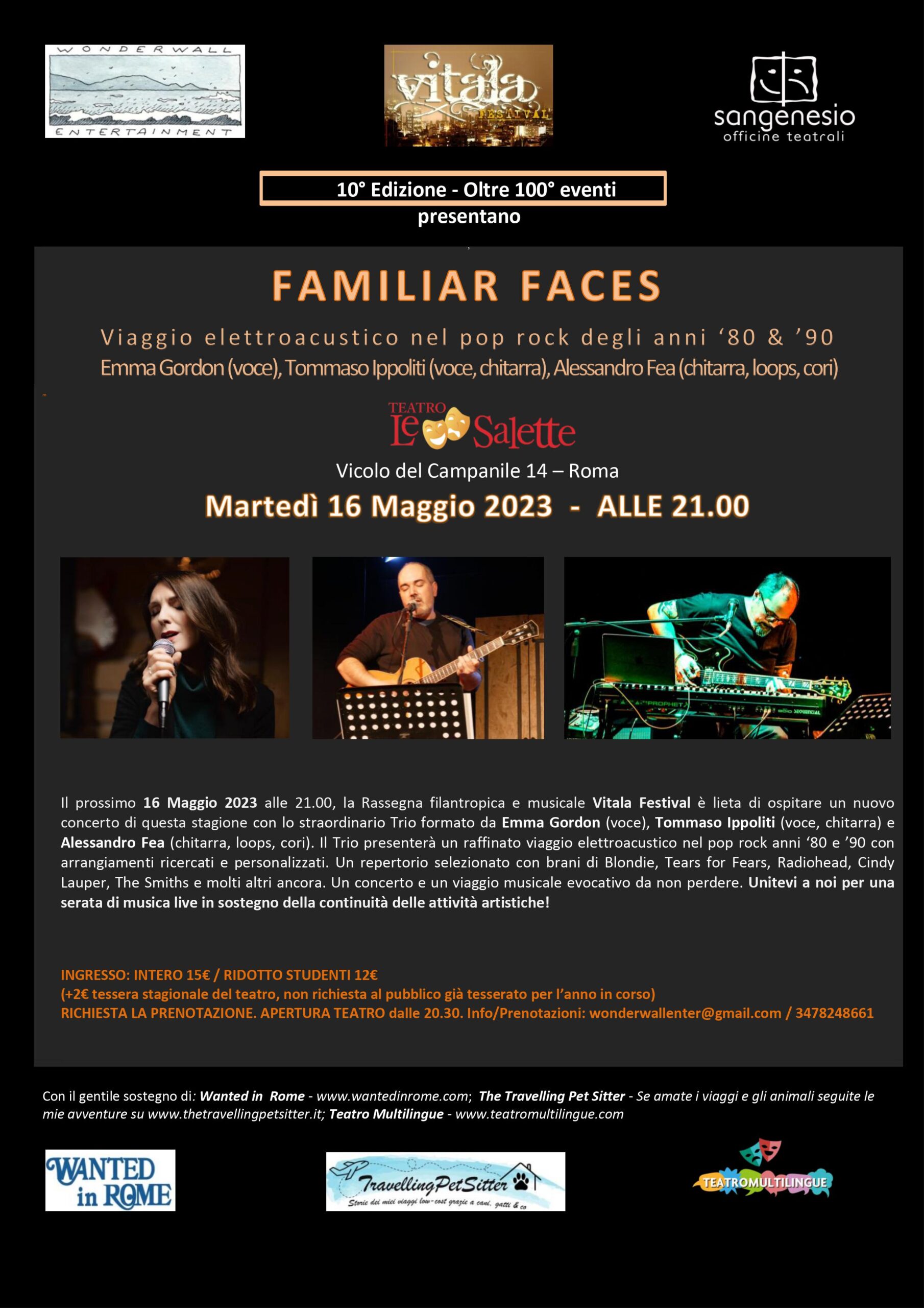 Il prossimo 16 Maggio 2023 alle 21.00, la Rassegna filantropica e musicale Vitala Festival è lieta di ospitare al Teatro Le Salette un nuovo concerto di questa stagione con lo straordinario Trio formato da Emma Gordon (voce), Tommaso Ippoliti (voce, chitarra) e Alessandro Fea (chitarra, loops, cori). Il Trio presenterà un raffinato viaggio elettroacustico nel pop rock anni ‘80 e ’90 con arrangiamenti ricercati e personalizzati. Un repertorio selezionato con brani di Blondie, Tears for Fears, Radiohead, Cindy Lauper, The Smiths e molti altri ancora. Un concerto e un viaggio musicale evocativo da non perdere. Unitevi a noi per questa serata speciale di musica dal vivo e per sostenere la continuità delle attività artistiche!