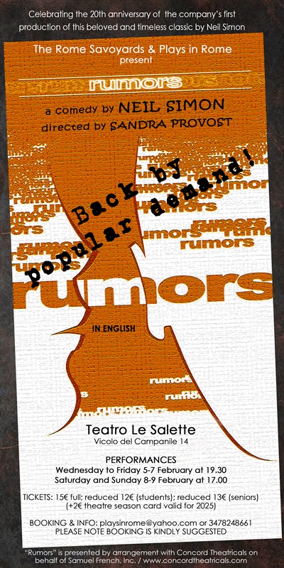 Dopo i precedenti successi dello stesso spettacolo presentato in lingua originale Inglese dalla compagnia The Rome Savoyards, torna a grande richiesta Rumors, commedia esilarante di Neil Simon.