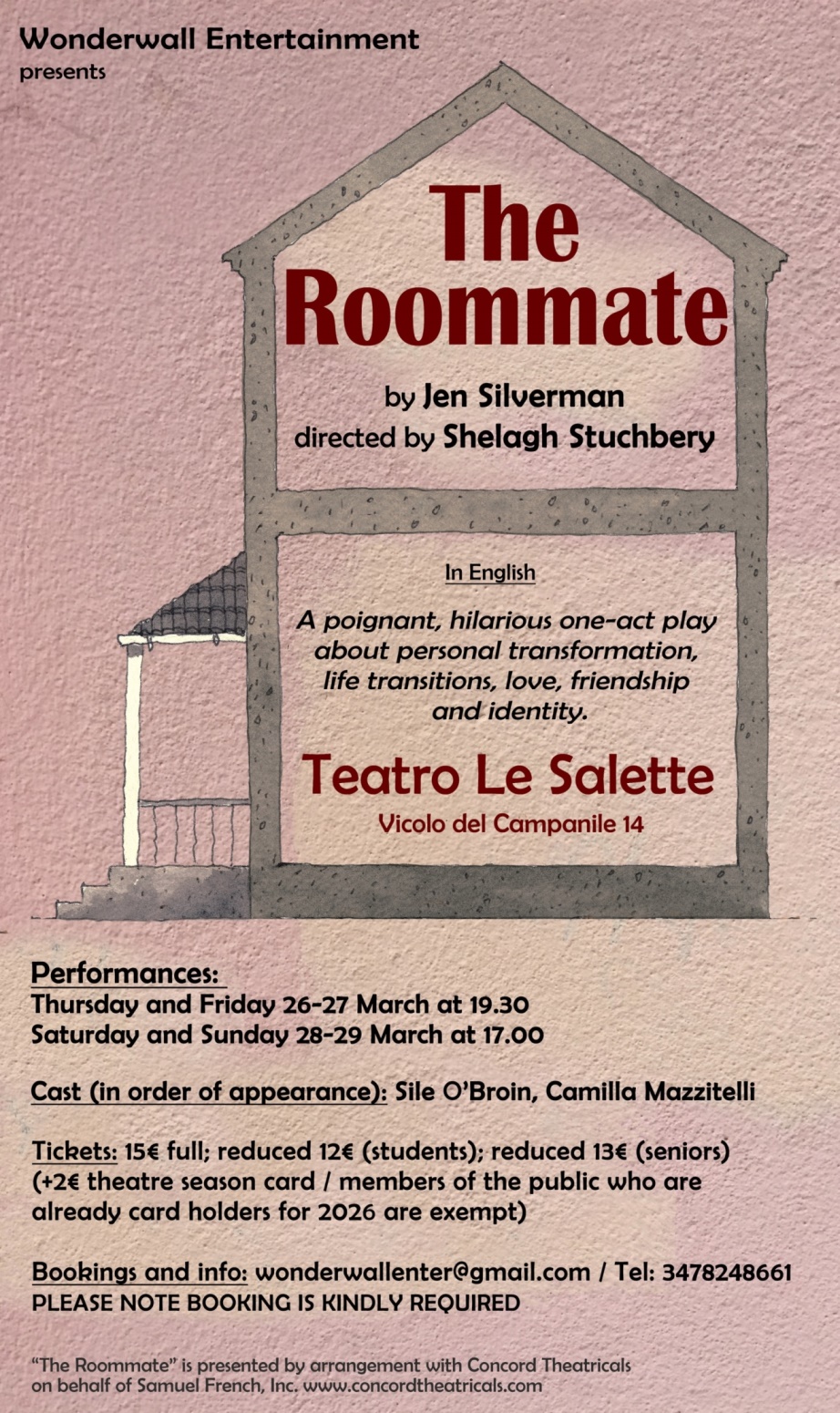 Nell’ambito della rassegna di teatro in lingua Inglese al Teatro Le Salette, la compagnia filantropica Wonderwall Entertainment è lieta di presentare The Roommate, atto unico comico, toccante e avvincente della pluripremiata scrittrice Jen Silverman. Diretto da Shelagh Stuchbery lo spettacolo sarà in scena dal 26 al 29 Marzo 2026.
