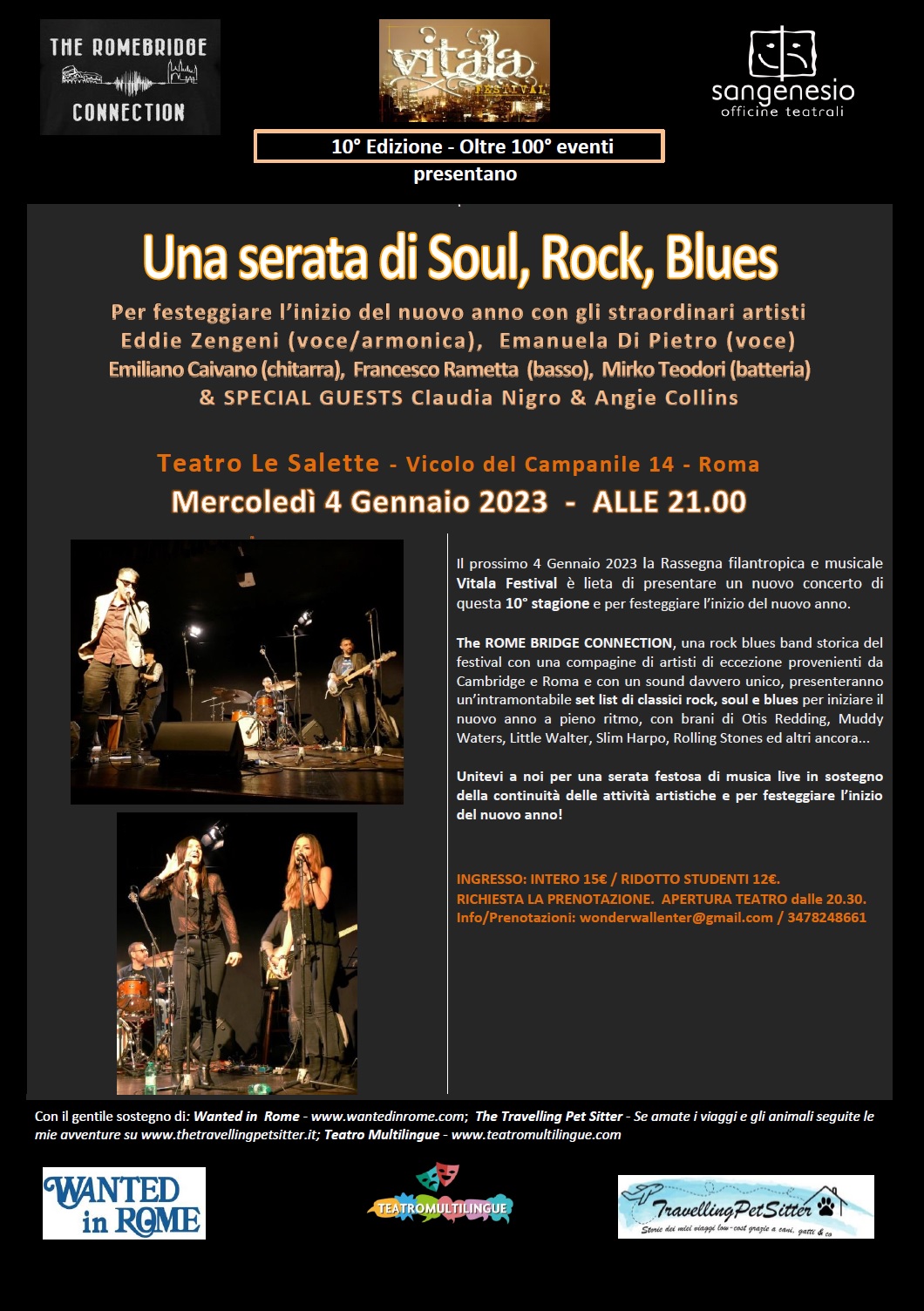 Il prossimo 4 Gennaio 2023, la Rassegna filantropica e musicale Vitala Festival è lieta di presentare un nuovo concerto di questa 10° stagione e per festeggiare l’inizio del nuovo anno. The ROME BRIDGE CONNECTION, una rock blues band storica del festival con una compagine di artisti di eccezione provenienti da Cambridge e Roma e con un sound davvero unico, presenteranno una set list di intramontabili classici rock, soul e blues per iniziare il nuovo anno a pieno ritmo, con brani di Otis Redding, Muddy Waters, Little Walter, Slim Harpo, Rolling Stones ed altri ancora…