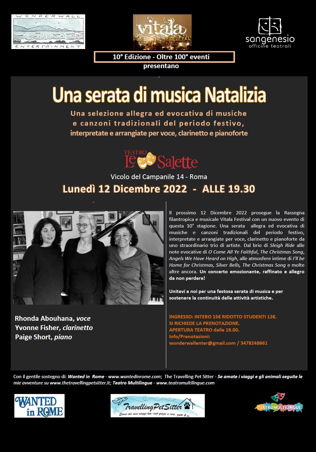 Lunedì 12 Dicembre 2022 alle 19.30, la Rassegna filantropica e musicale Vitala Festival presenta un nuovo evento di questa 10° stagione. Una serata allegra con musiche e canzoni tradizionali del periodo festivo, interpretate e arrangiate per voce, clarinetto e pianoforte da uno straordinario trio di artiste. Dal brio di Sleigh Ride alle note evocative di O Come All Ye Faithful, The Christmas Song, Angels We Have Heard on High, alle atmosfere intime di I’ll be Home for Christmas, Silver Bells, The Christmas Song e molte altre ancora. Un concerto emozionante, raffinato e allegro da non perdere! Unitevi a noi per questa bella serata di musica festiva e per sostenere la continuità delle attività artistiche! Grazie del sostegno!