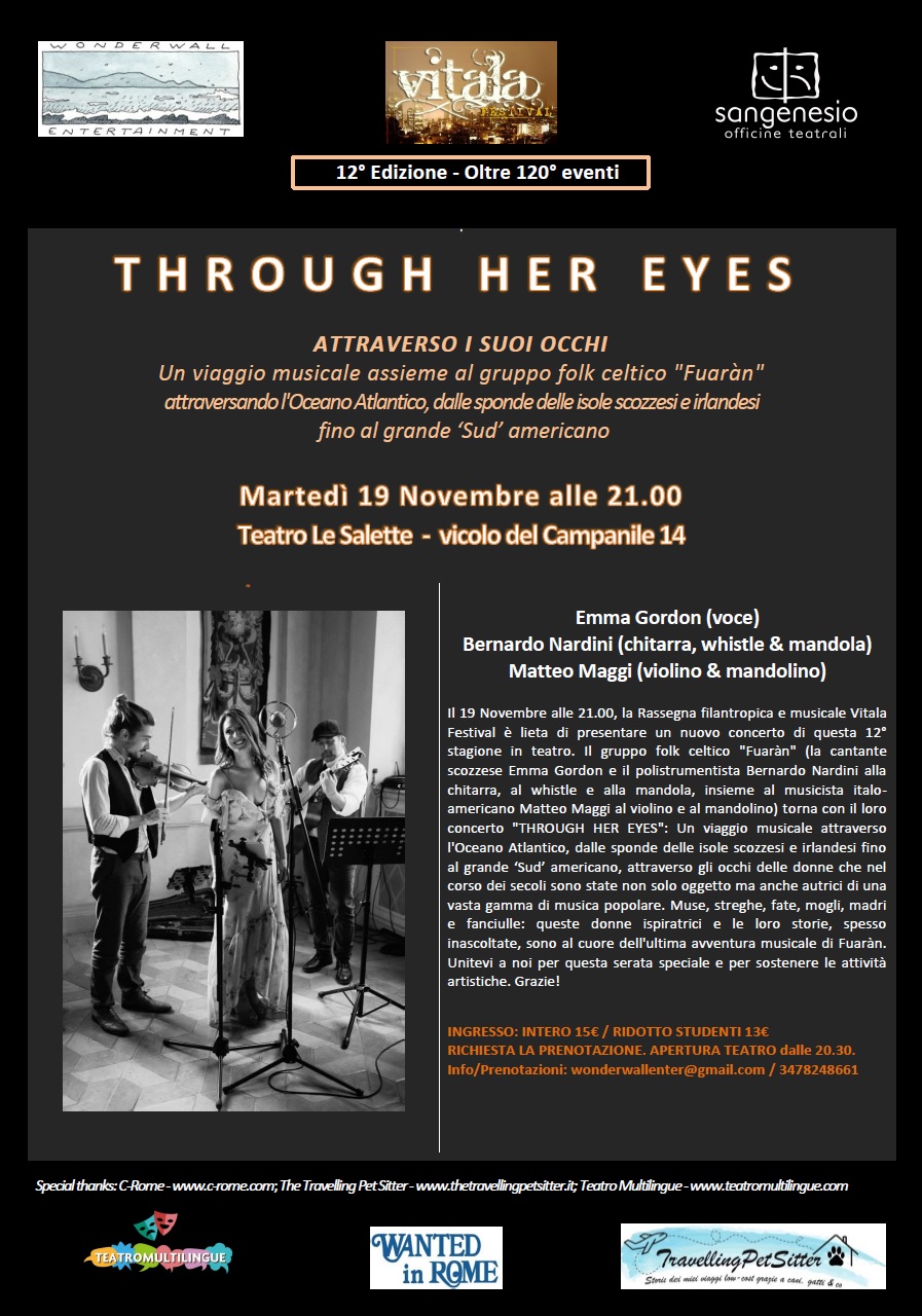 Il 19 Novembre alle 21.00, la Rassegna filantropica e musicale Vitala Festival è lieta di presentare un nuovo concerto di questa 12° stagione in teatro. Il gruppo folk celtico “Fuaràn” (la cantante scozzese Emma Gordon e il polistrumentista Bernardo Nardini alla chitarra, al whistle e alla mandola, insieme al musicista italo-americano Matteo Maggi al violino e al mandolino) torna con il loro concerto “THROUGH HER EYES”: Un viaggio musicale attraverso l’Oceano Atlantico, dalle sponde delle isole scozzesi e irlandesi fino al grande ‘Sud’ americano, attraverso gli occhi delle donne che nel corso dei secoli sono state non solo oggetto ma anche autrici di una vasta gamma di musica popolare. Muse, streghe, fate, mogli, madri e fanciulle: queste donne ispiratrici e le loro storie, spesso inascoltate, sono al cuore dell’ultima avventura musicale di Fuaràn. Unitevi a noi per questa serata speciale e per sostenere le attività artistiche. Grazie!
