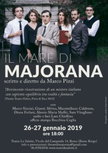 In questa riduzione per sei attori (il testo originario è per undici), attorno al protagonista troviamo la sorella Maria, anima dolce e delicata; l’amico e collega Giovanni Gentile jr. figlio dell’omonimo filosofo; Edoardo Amaldi, fedele discepolo di Fermi, e il sanguigno Emilio Segré, con cui Majorana ebbe un lacerante screzio sulle leggi razziali proprio a ridosso della scoperta del positrone; infine la studentessa Senatore, a cui Majorana consegnò le sue ultime carte prima di scomparire.