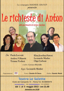 Opere giovanili del grande drammaturgo, ma già mature e perfette nella loro struttura teatrale. In esse esce fuori l’aspetto ironico, grottesco di Cechov , e soprattutto la trasformazione del serioso in faceto. Nell’ “Orso” lo scontro tra la vedova Popova e il rude Smirnov arriva a livelli parossistici per poi concludersi in maniera inaspettata. Ne il ” tabacco” l’argomento ” richiesto” non viene per niente sfiorato e nella “domanda” il mite Ivan si trasforma davvero in un attaccabrighe. E comunque le “richieste” iniziali che danno l’avvio alle pieces vengono in certo qualmodo tutte disattese o quanto meno snaturate. Lo spettacolo, nell’ideazione di Leonardo Madier, si svolge senza interruzioni in un tempo unico. E’ condotto in modo brillante , pieno di ilarità e con delle gradevoli trovate sceniche. Gli attori bravissimi e preparati rendono al meglio i personaggi cecoviani e creano quell’atmosfera di piacevolezza che fa riconciliare lo spettatore con il teatro.