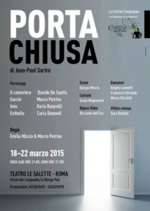 La Compagnia ha scelto di rappresentare il teatro esistenzialista francese, quel teatro di parola e di negazione, rivisitato e adattato agli occhi di spettatori abituati quasi a tutto. E se una volta a teatro si riportasse il teatro, quello di situazione e di parola? Potrebbe interessare a qualcuno? Ecco perché si è scelto “Porta Chiusa” di Jean-Paul Sartre. Un teatro che potrebbe essere sentito alla radio, ad occhi chiusi, senza acrobazie o tensioni muscolari; un teatro fatto di logica e di voce. Il progetto è quello di mettere in scena un teatro “intimo” dove le parole degli attori potessero fondersi ai respiri del pubblico, un teatro vivo senza distanze. Un esperimento nuovo al quale solo quei futuristi greci avevano pensato. L’unica novità che si vuole dare è una multivisione dello spettacolo, un dramma di circa un’ora e mezza diretto da una doppia regia, quella di Emilia e quella di Marco.
